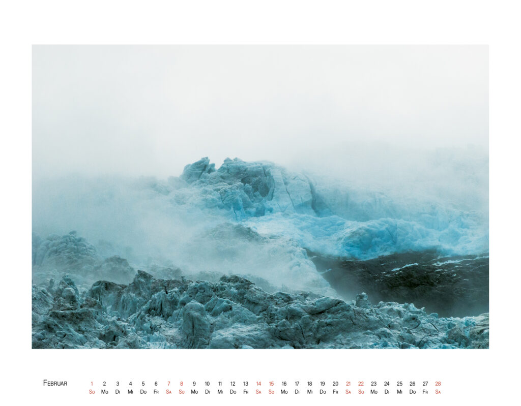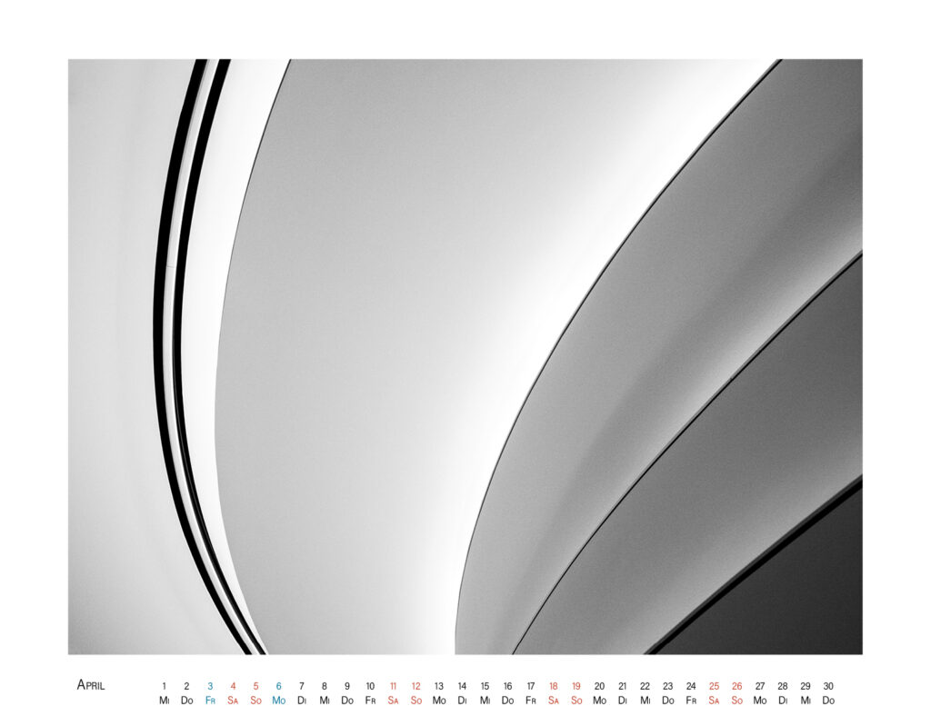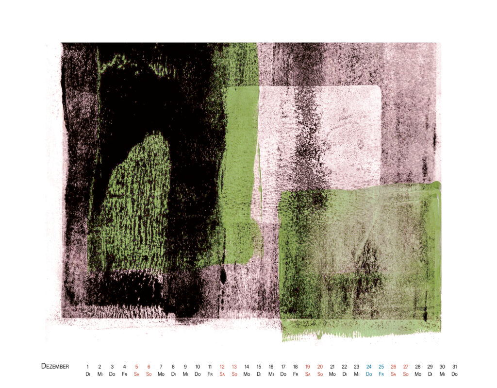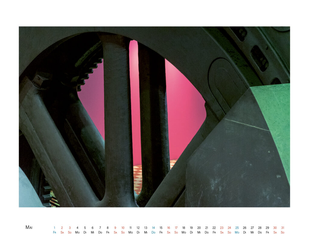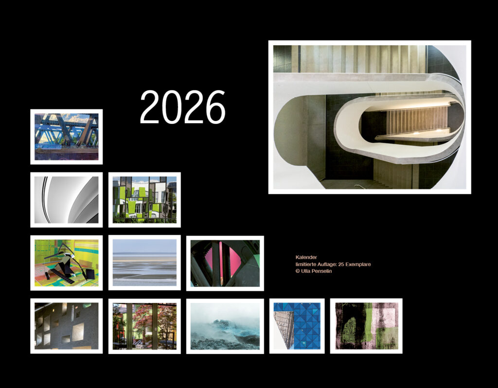 Kalender 2026 im Format 41 cm x 32 cm, 14 Seiten (Titelblatt, 12 Kalenderblätter mit „zurückhaltendem“ Kalendarium, Rückpappe); Digitaldruck auf weißem Papier (heaven42, 300 gsm), silberne Wire-O-Bindung.