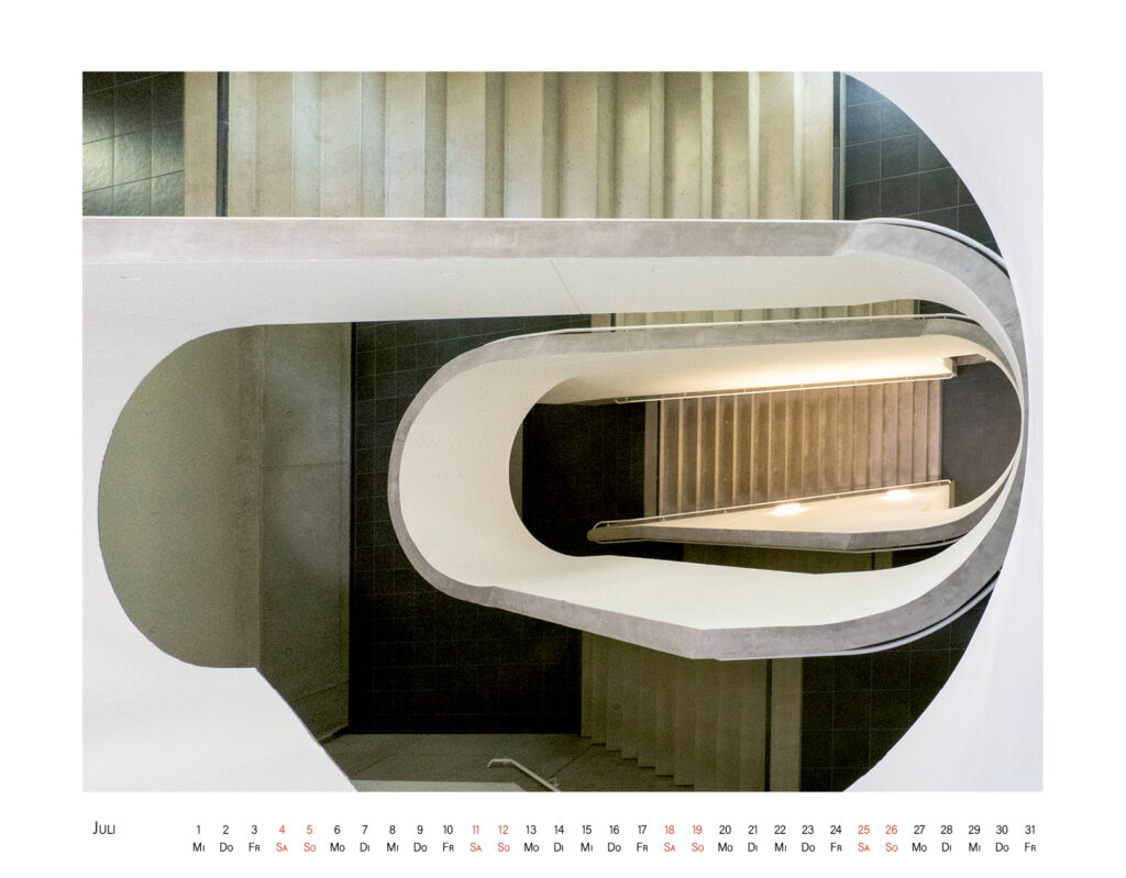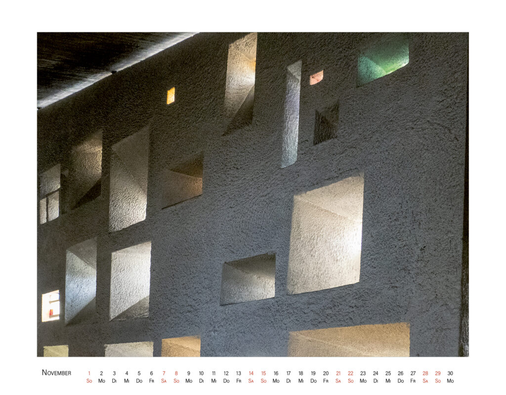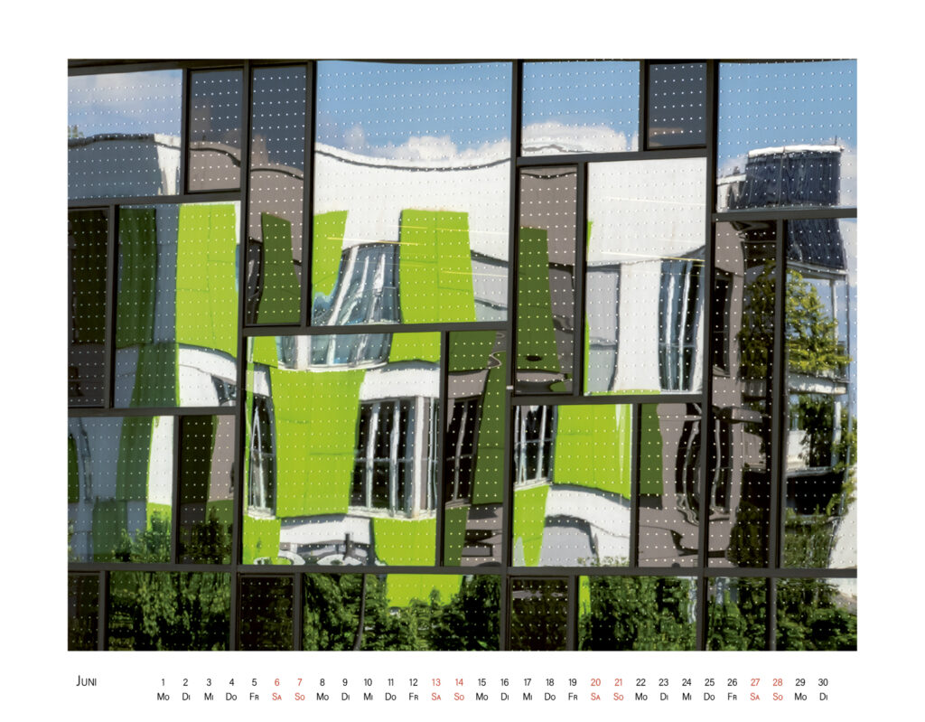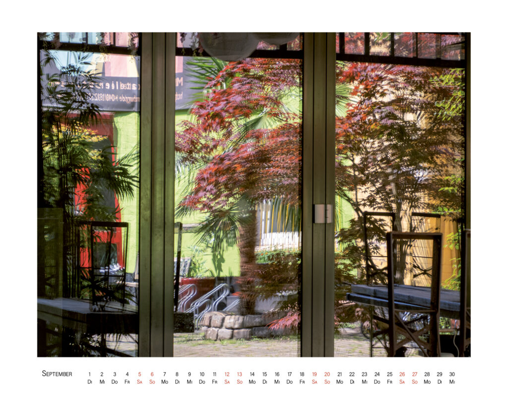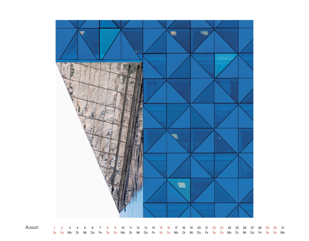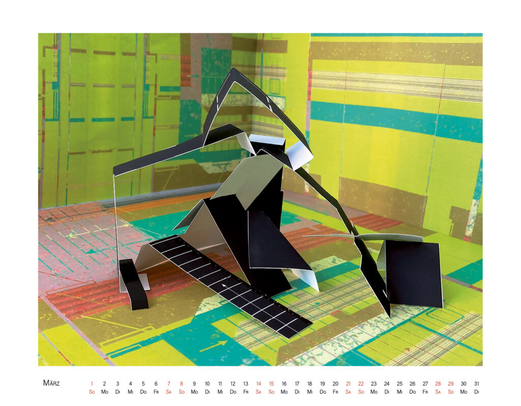 Kalender 2026 im Format 41 cm x 32 cm, 14 Seiten (Titelblatt, 12 Kalenderblätter mit „zurückhaltendem“ Kalendarium, Rückpappe); Digitaldruck auf weißem Papier (heaven42, 300 gsm), silberne Wire-O-Bindung.